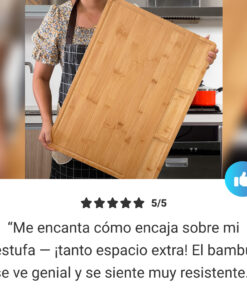 La tabla de cortar extra grande BambooCraft ofrece una superficie generosa de 75 x 54 x 8.5cm, diseñada para el uso tradicional y para ser colocada sobre fregaderos o estufas.