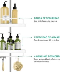 Cuenta con 4 estantes grandes que cuentan con espacios diseñados para jabón y otros accesorios de ducha y tienen orificios que evitan la acumulación de agua.