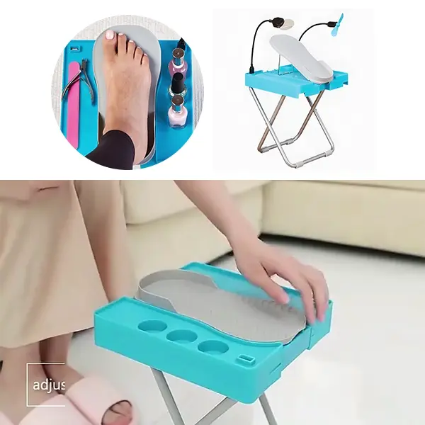 ¡Obtén pedicura de salón en casa con NailEase! Este reposapiés ajustable ofrece una plataforma estable y cómoda para pintar las uñas sin doblarse ni estirarse. Con luz LED integrada, ventilador y compartimentos, es perfecto para un cuidado de uñas sencillo y sin desorden.