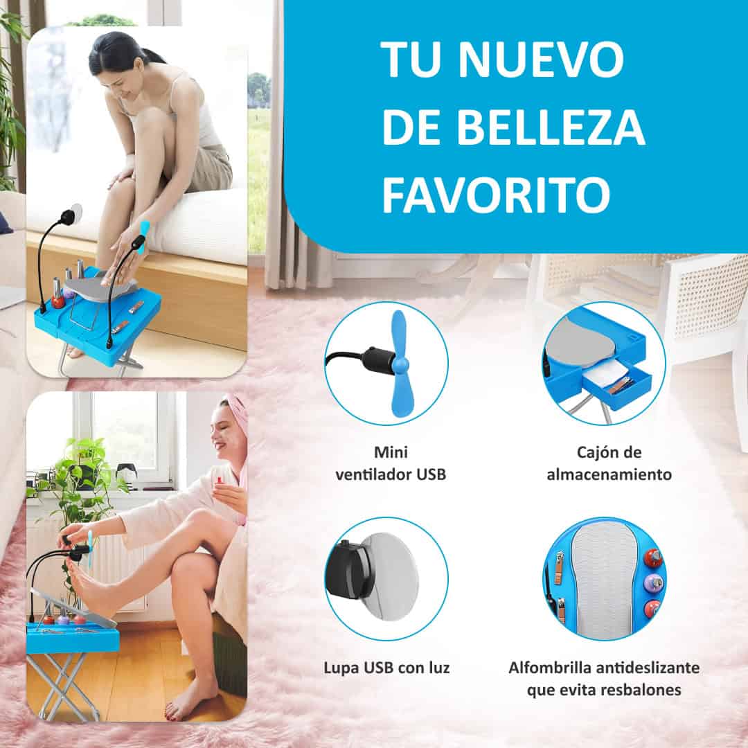 ¡Me encanta! No más dolor de espalda mientras me hago las uñas. La luz LED y la lupa ayudan con los detalles, y el ventilador seca el esmalte rápidamente. Es estable y fácil de guardar. Un imprescindible para la pedicura en casa.