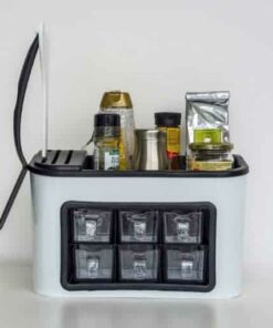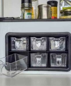 - Cuenta con unas ranuras estrechas para cuchillos, una ranura más ancha para utensilios, una bandeja grande para condimentos, latas y frascos, y seis cajones para tus especias favoritas.